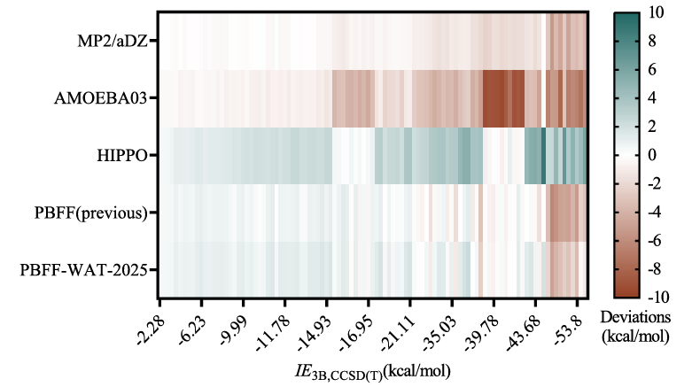 三体相互作用本质上具有非加和性,主要源于极化效应。在极化力场模型中,不同方法对三体相互作用能的描述能力存在差异。Figure1(原文Figure 2)展示了MP2/aug-cc-pVDZ、AMOEBA03、HIPPO和PBFF-WAT-2025水模型计算纯水团簇的总三体作用能与高精度的CCSD(T)方法的误差。图中结果表明,PBFF-WAT-2025水模型可以在不同尺寸团簇中均保持优异的一致性,在多体极化效应的描述方面展现出卓越的稳定性与迁移能力。