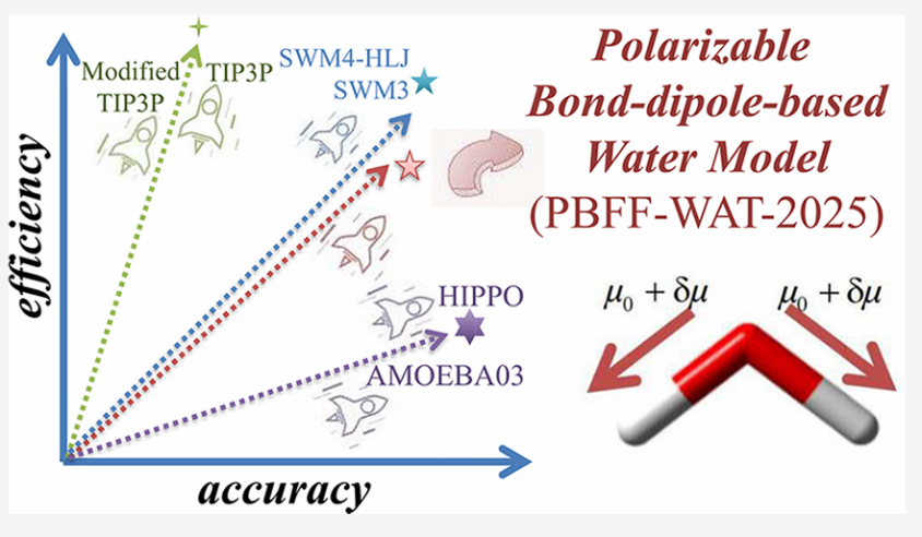 水分子间的氢键网络赋予其独特的物理化学性质,直接调控蛋白质、核酸等生物大分子的构象稳定性与功能活性。基于分子力学的水模型的计算精度和计算效率很大程度上影响着生物大分子多尺度模拟的可靠性和可行性,推动着高精度和高效率的可极化水模型的持续发展。针对前述挑战,基于课题组多年来创立和发展的可极化化学键偶极模型,王长生教授团队构建了基于化学键偶极的可极化水模型(PBFF-WAT-2025),该模型兼顾了计算精度和计算效率,为生物大分子体系在水溶液下的多尺度模拟提供了一种新方法。